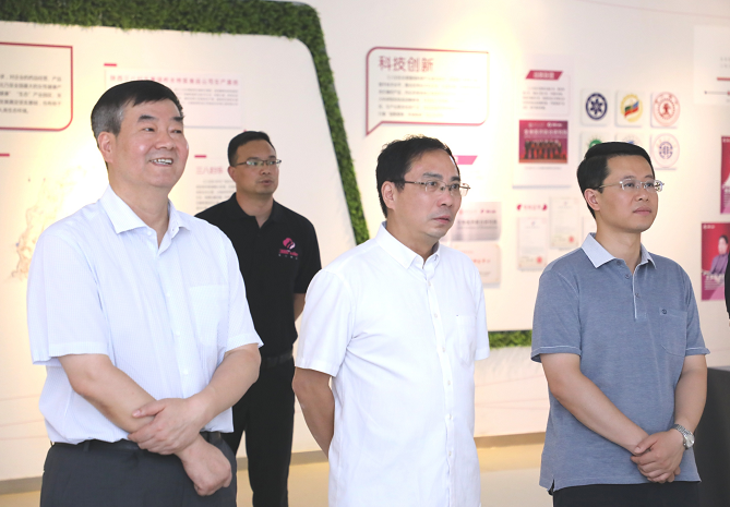 單舒平書(shū)記(右二)和張辰宇院長(zhǎng)(右三)及袁曉峰董事長(zhǎng)共同參觀企業(yè)展廳